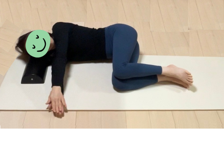 ◎骨盤は床と垂直な状態を維持したまま身体を回旋させることで、胸周り(胸郭)の柔軟性向上、捻りの動作がしやすくなり、背中がスッキリ、コリ・ハリの解消にも効果的です。